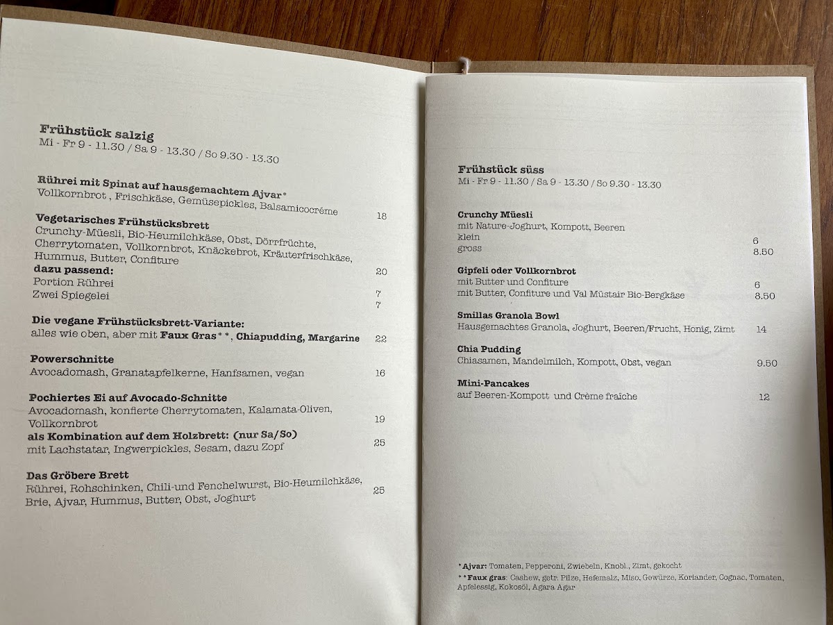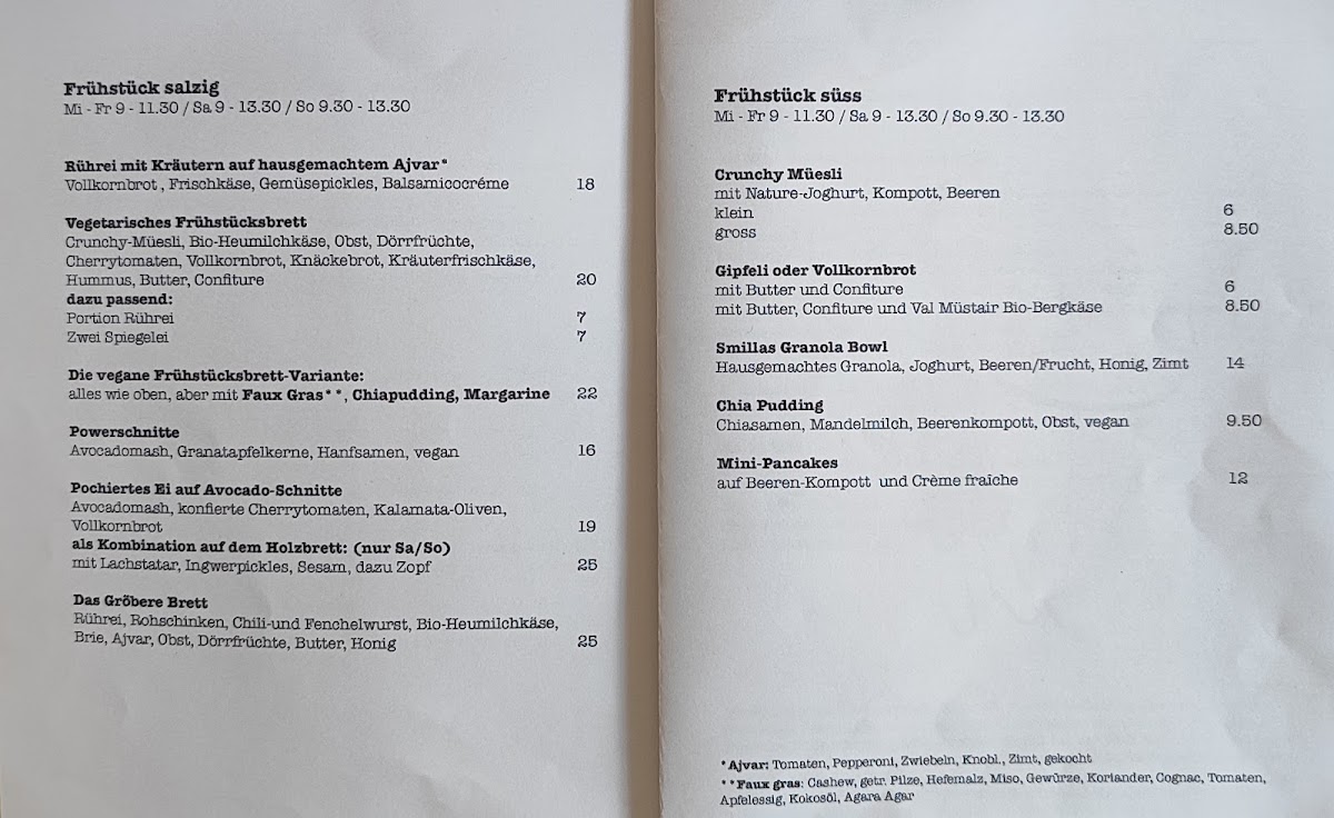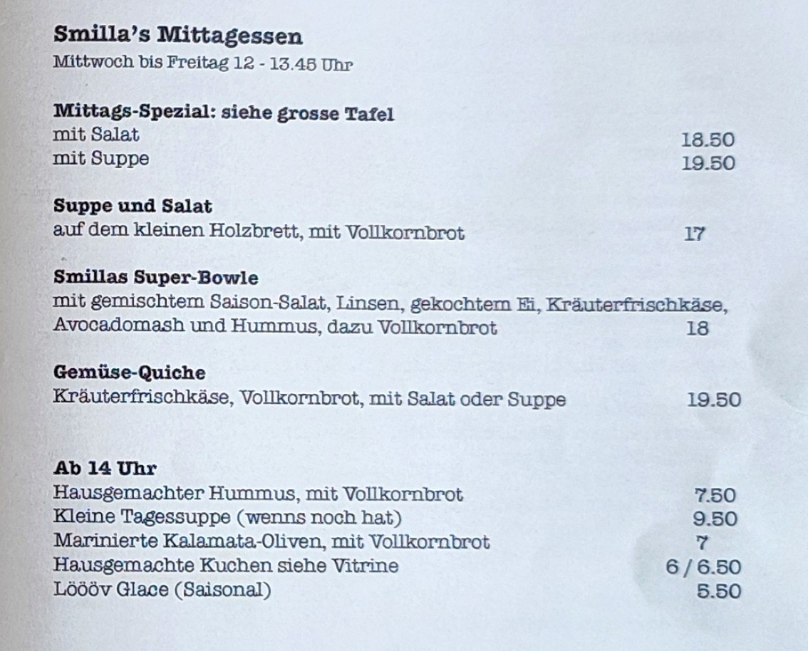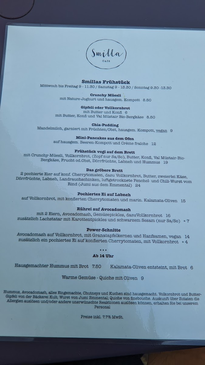 Smilla Café in Basel is a delightful blend of cozy ambiance and quality cuisine, perfect for breakfast, brunch, or a casual coffee break. The menu highlights fluffy mini pancakes, which have quickly become a customer favorite for their light texture and authentic flavor. Health-conscious options shine through carefully crafted brunch platters, featuring fresh yoghurt, vibrant seasonal fruits, and nourishing turmeric lattes that balance taste with wellness. The coffee selection, including expertly brewed cappuccinos and espressos, pairs wonderfully with their homemade carrot cake—an indulgent yet comforting treat. Smilla Café also offers balanced lunch choices catering to those seeking wholesome, satisfying meals. Warm, attentive service complements the food, making each visit feel personal and inviting. Though the menu leaves room for additions like eggs benedict, its current offerings deliver a perfect harmony between taste and atmosphere, making Smilla Café a cherished spot for locals and visitors alike.